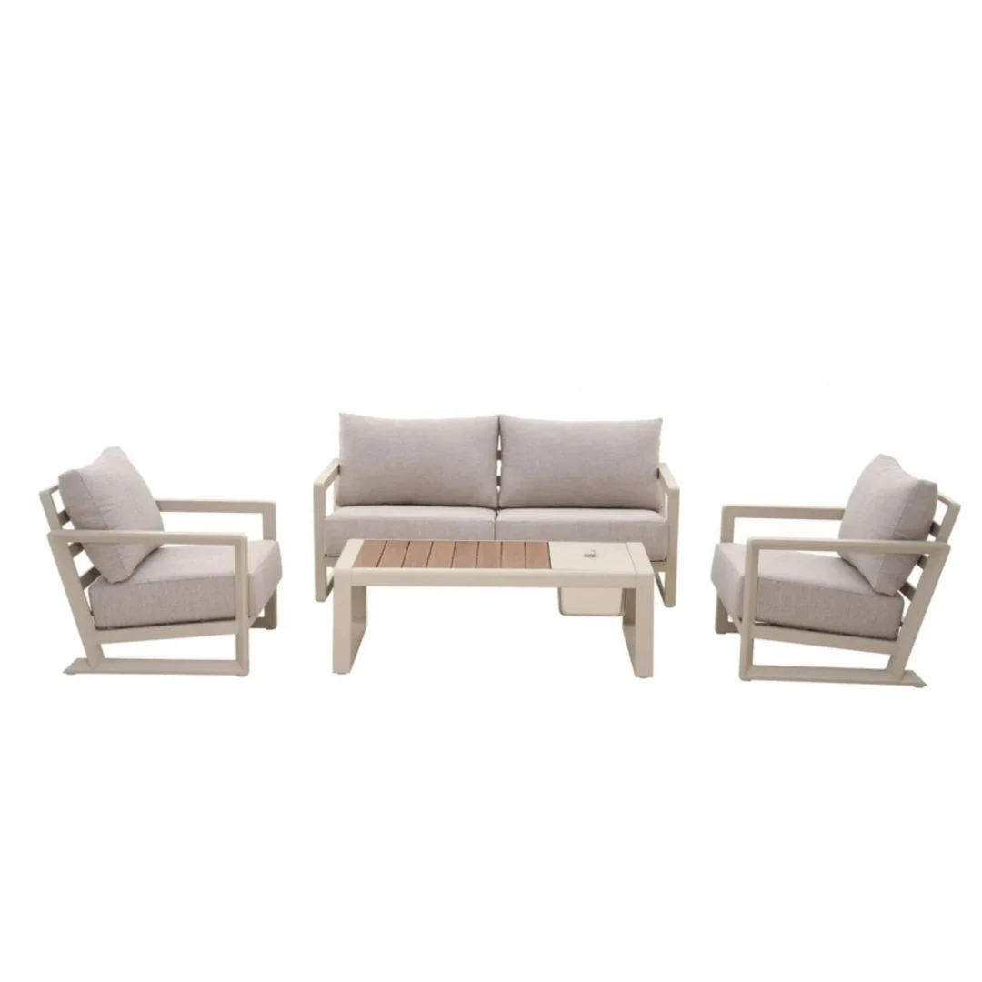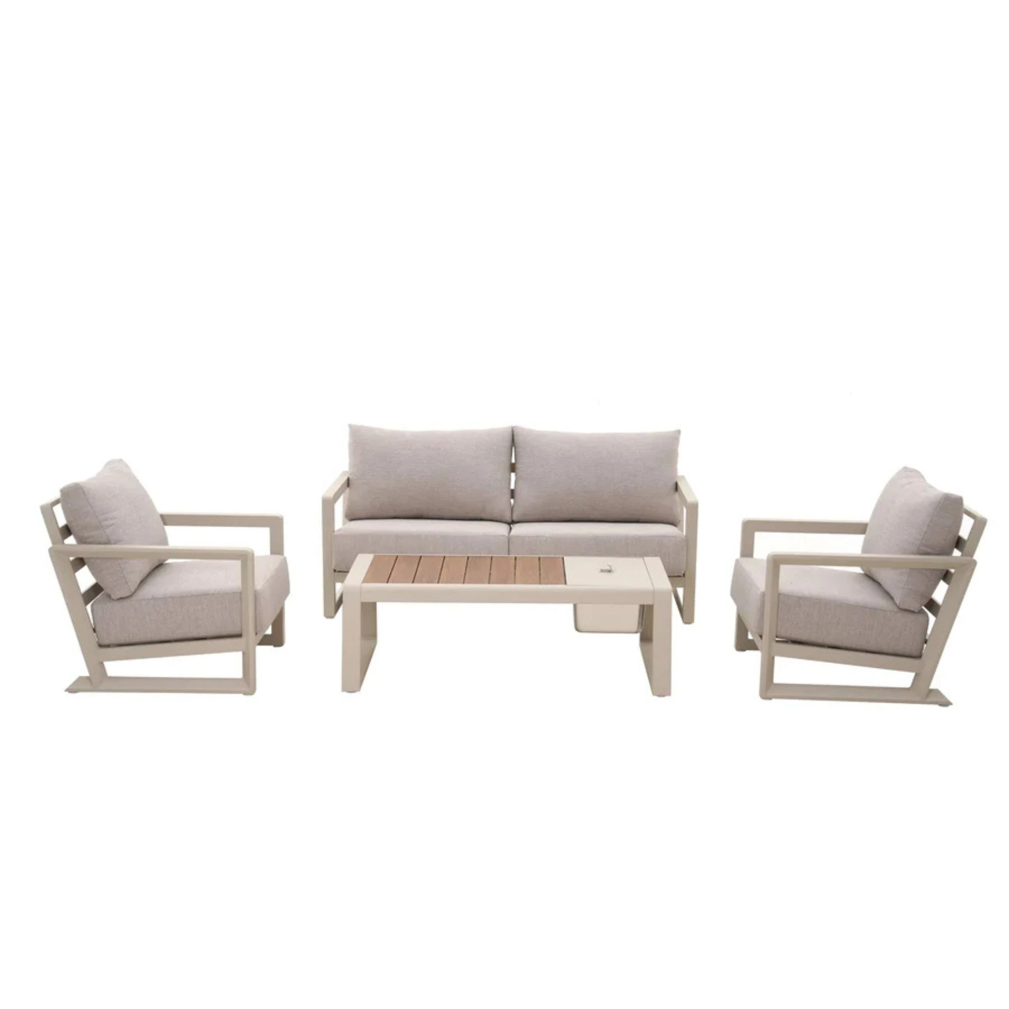 Ce salon extérieur associe une structure aluminium légère et robuste à un cordage synthétique haute résistance, offrant un style moderne et aéré. Ses coussins épais garantissent un excellent confort pour des moments de détente prolongés.